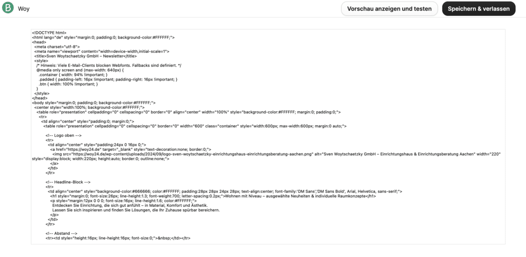 Beispiel-Output des KI-Agenten: Der Newsletter-Code wird automatisch erstellt – ganz ohne Programmierkenntnisse.